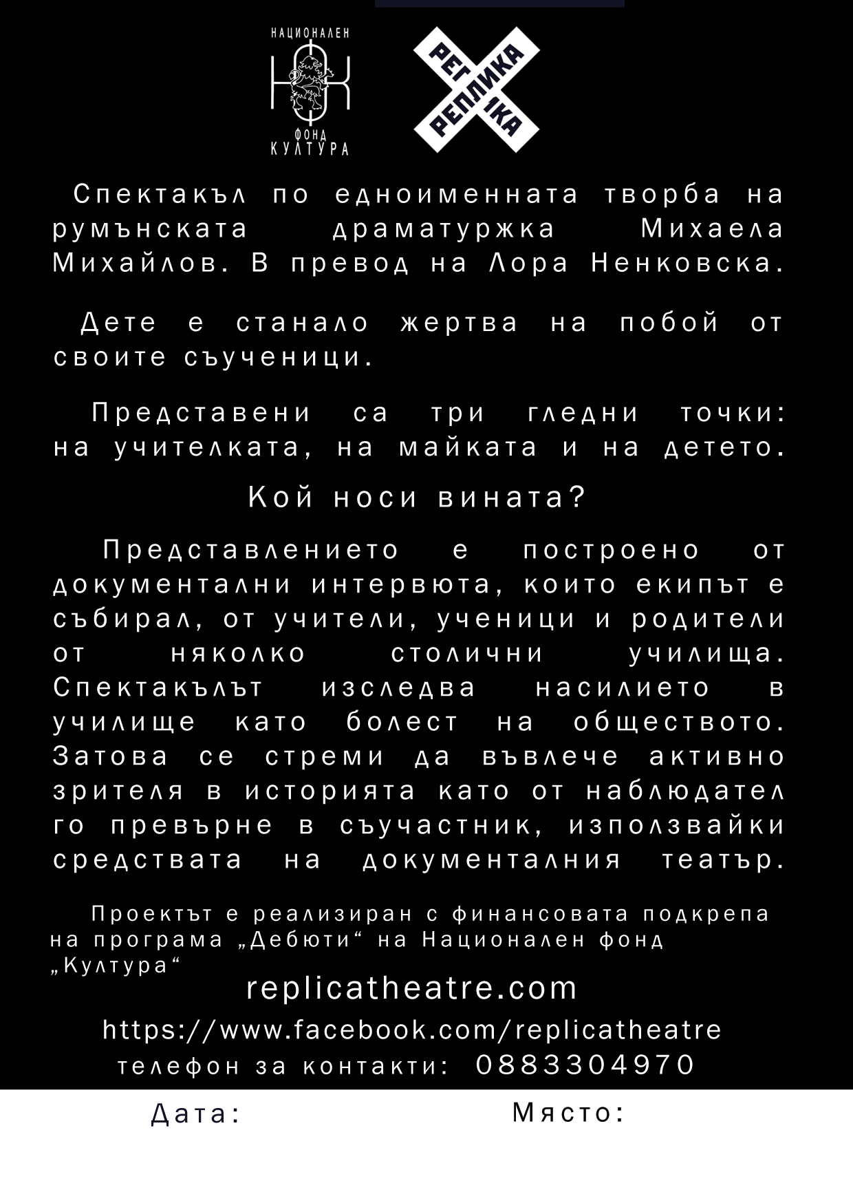 Представлението "Лоши деца" e моно-спектакъл по пиесата „Лоши деца“ на Михаела Михайлов с актрисата Боряна Пенева. Получи се едно социално ангажирано представление, което използва изразните средства на документалния театър – интервюта, лични истории и преживявания. Една актриса пресъздава три образа: на майката, на учителката и на детето, за да може да намери отговор на въпроса „Кой е виновен за насилието в училище“ Сблъсъкът между вина и отговорност в случаите на насилие в училище; Травматичният избор между етика и сензация в медийното отразяване на случаите на насилие над деца; Целта на спектакъла е, като използва текста на пиесата „Лоши деца“ и инкорпорира документални интервюта, направени от екипа на представлението с деца и учители от няколко столични училища, да послужат за едно дълбоко изследване на проблемите в образователната система, като представят гледните точки на родителите, децата и учителите. Другата цел е това представление да стигне до по-голям брой младежи, които са засегнати пряко или косвено от проблемите на образователната система и училищното насилие, като по този начин се опитаме не само да повдигнем важни социални въпроси, но и да отключим обществен дебат по тях. Също така се постарахме да представим проблемите на медийното отразяване на горепосочените социални недъзи.